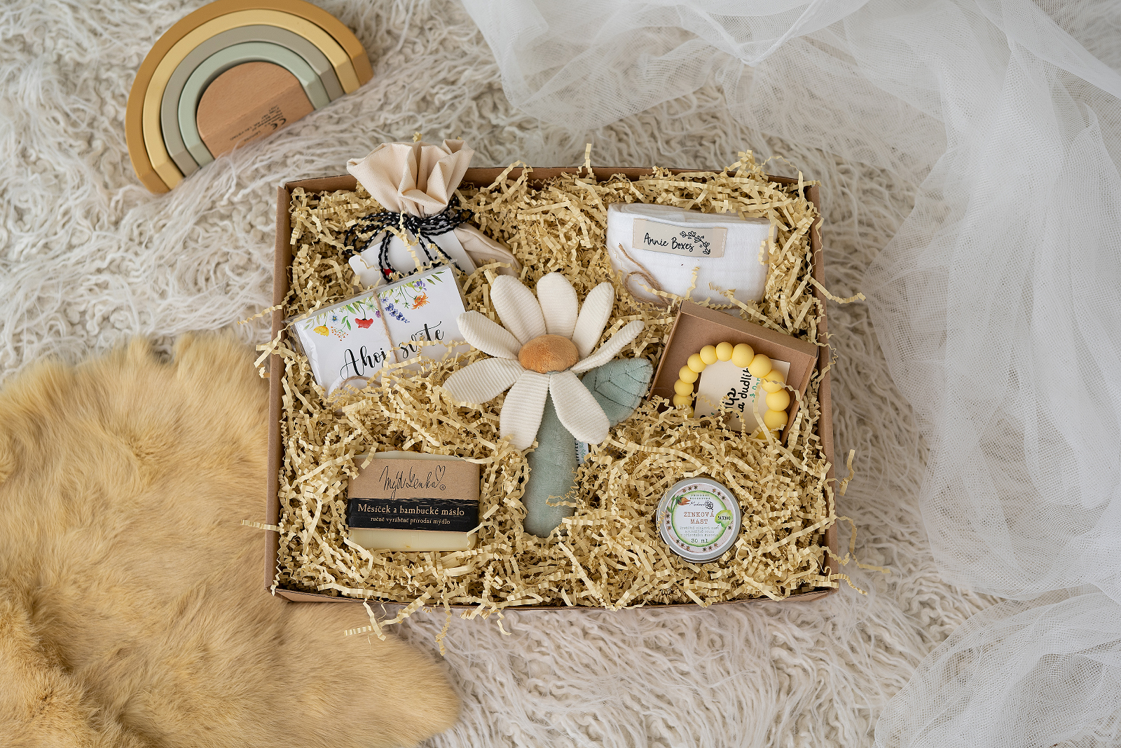 v annie boxes také Spolupracují s jinými lokálními značkami a snaží se tak podporovat českou autorskou tvorbu. proto v krabičkách najdete např. značku Ababu, kosmetiku od Medárka nebo krásně vonící mýdla od Mýdlenky, oblečení Jožánek nebo milníkové kartičky od Zuzadesign a spoustu dalšího. Samozřejmě nezapomínají ani na maminky, a tak v balení najdete i něco, co potěší přímo také je, jako třeba vynikající čokoládové pralinky od čokoládovny Janek.